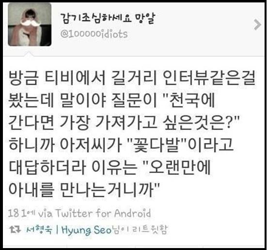 게시물의 내용에는 “방금 TV에서 길거리 인터뷰 같은 걸 봤는데 말이야 질문이 "천국에 간다면 가장 가져가고 싶은 것은?"하니까 아저씨가 ‘꽃다발’이라고 대답하더라"며