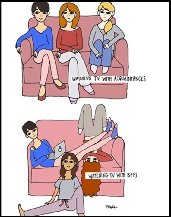 그림을 보면 격식을 차리고 있을 때와 절친끼리 있을 때의 TV보는 모습이 달라 웃음을 자아낸다.