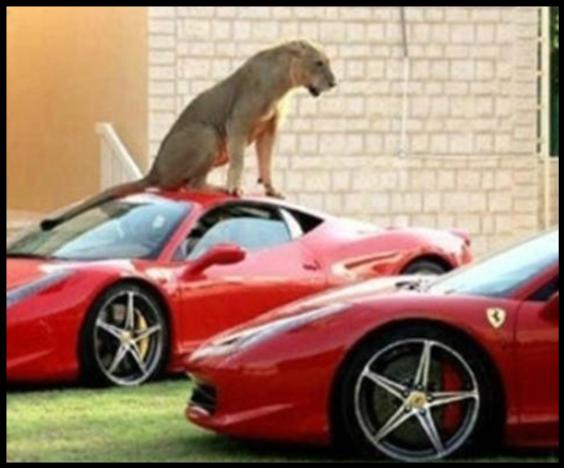 사진에는 빨간색 페라리 차량 위에 사자가 올라가 있어 절대 차는 훔칠 수 없을 듯 하다.