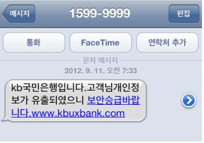 'KB국민은행입니다. 고객님 개인정보가 유출되었으니 보상승급바랍니다. www.kbuxbank.com' 라는 내용.