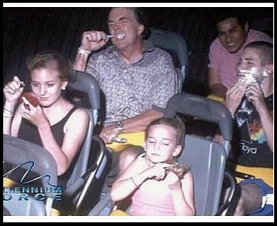 사진에서 이 가족은 빠르게 돌아가는 롤러코스터에서 양치질, 면도, 화장 등을 하고 있어 놀라움을 준다.