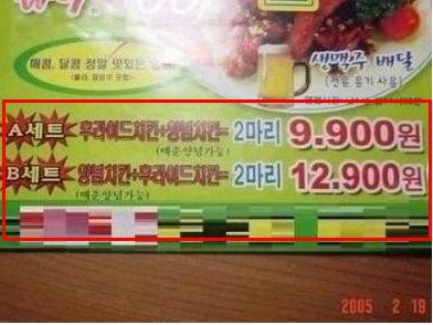 사진 속 A세트는 후라이드 치킨+양념치킨으로 두 마리에 9.900원이다. B세트는 양념치킨+후라이드 치킨 세트로 2마리에 12.900원이다.