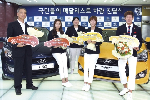 현대차는 선수들의 희망에 따라 장미란, 정진화, 양수진 선수에게는 벨로스터 터보를 김연경, 손연재 선수에게는 i30를 전달했다.