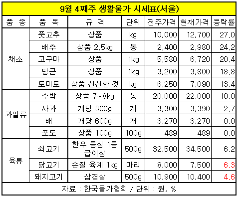 정부 허가 전문가격조사기관인 한국물가협회가 지난 19일 기준으로 전국 재래시장 및 대형마트에서 판매되는 식품가격을 조사해 20일 발표한 데 따르면 서울 지역의 경우 풋고추, 배추, 고구마, 당근, 토마토 가격이 전주 대비 13% 이상 뛰었고 부산 대구 광주 대전 등 지방에선 대파 가격이 9% 이상 올랐다.