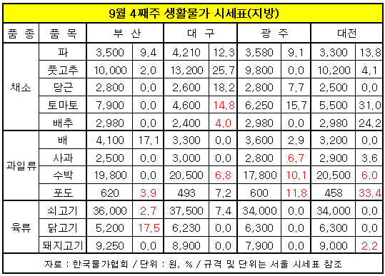 과일류 중 배는 부산지역이 유일하게 17.1%로 두자릿 수 이상 올랐고 사과, 수박, 포도 등은 지역별로 등락차이가 있지만 대체로 하락했다.