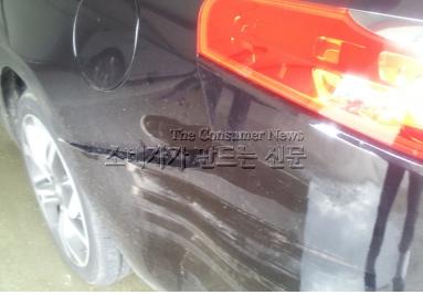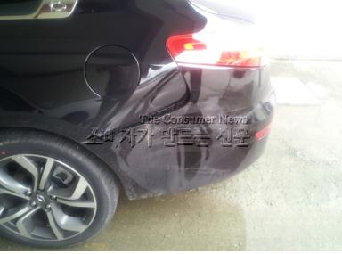 금요일 12시경 영업사원으로부터 "내 실수로 평택영업소 주차 중 뒷 범퍼가 좀 찌그러졌다"고 연락이 왔더군요. 즉시 택시를 잡아타고 가보니 좌측의 주유구에서 루프까지 이어지는 판과 좌측 뒷 범퍼가 심하게 움푹 패였습니다. 1주일도 안 된 신차가 사고 난 중고차가 되었습니다.