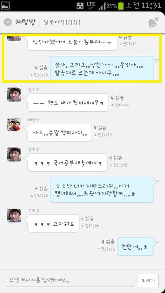 배우 엄태웅이 20일 자신의 트위터에 '자랑스런 우리 종민이!'라는 메시지와 함께 '1박2일' 단체채팅 내용을 공개했다.