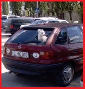자동차 차창이 애완견을 위해 일부러 뚫려 있는 듯 보여 개 주인의 배려를 느낄 수 있다. 자신의 애완견이 차 안에서 답답할 것을 대비해 차창 밖으로 바람을 쐬라는 의도로 개 머리 크기 만큼의 구멍을 유리창에 뚫어놓은 것.