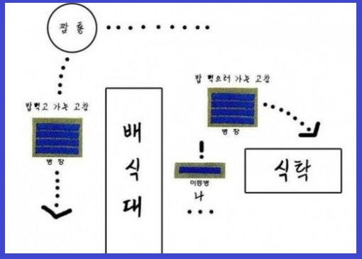 이어 게시자는 “마침 배식을 받고 고참을 발견했는데, 밥을 먹고 가는 고참과 밥을 먹으러 가는 고참이 있었다”며 “이 둘을 동시에 발견한 나는 반사적인 인사말 신경과 갈등이 무수한 충돌을 일으키다가 ‘맛있게 드셨소’라고 외쳤다”며 웃지못할 헤프닝을 전했다.
