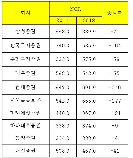 자기자본 기준 국내 10대 증권사의 6월 말 현재 NCR은 삼성증권이 820.0%로 가장 높다. 이어 신한금융투자(665.0%), 현대증권(601.0%), 한국투자증권(585.0%), 우리투자증권(575.0%), 대우증권(543.0%) 순이다.