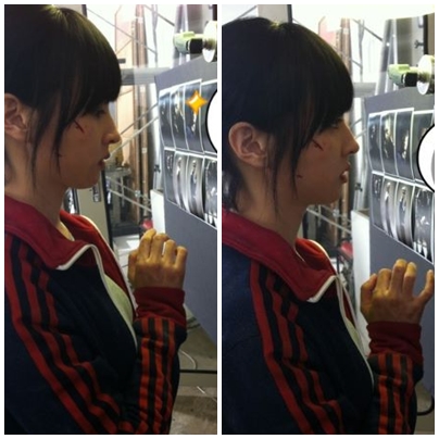 20일 한혜진은 자신의 트위터에 "손가락을 왜? 또 본인 연기가 아쉬워 뒷연기 중"이라는 글과 함께 사진을 공개했다.