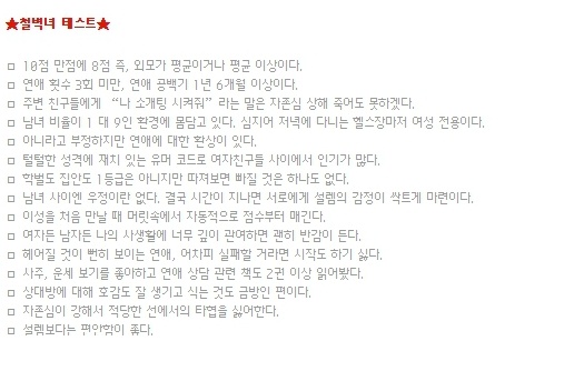 이에 따르면 제시된 항목중 8개 이상이 자신에게 해당한다면 당신은 '철벽녀'라고 한다. ‘철벽녀 테스트’ 게시물을 접한 네티즌들은 “헉 완전 내 이야기네” “철벽녀 테스트 은근히 정확한 듯” 등의 다양한 반응을 보였다.