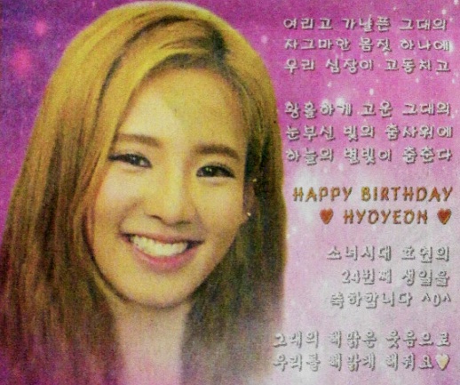 소녀시대 효연의 24번째 생일을 축하하기 위해 팬카페 ‘시스터스’가 신문광고를 냈다.
