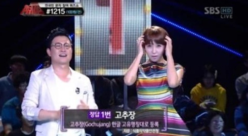 이에 김성주는 “해외에서 ‘강남스타일’이 인기인 이유는 강남 발음이 쉽기 때문이라더라”며 “고추장도 그대로 발음되는데 나머지는 발음하기 힘들다”며 고추장을 선택해 답을 맞췄다.(사진-SBS 방송 캡처)