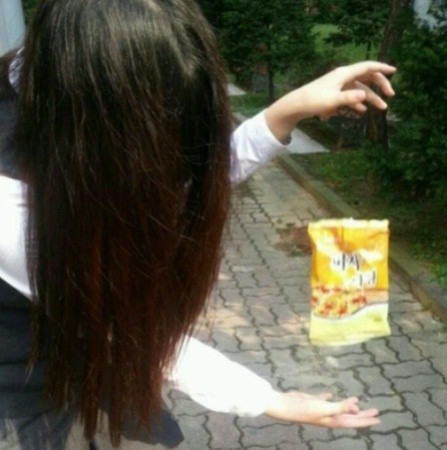 하지만 이 사진은 위에서 떨어뜨린 과자 봉지를 순간적으로 촬영한 것으로, 초능력과는 관련이 없다.