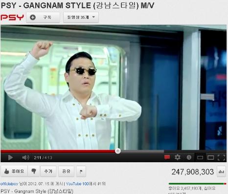 복수 매체에 따르면 ‘강남스타일’ 뮤직비디오는 유튜브에 공개된 지 52일 만인 지난 4일 한국 콘텐츠로는 처음으로 조회수 1억 건을 돌파한 것으로 나타났다.