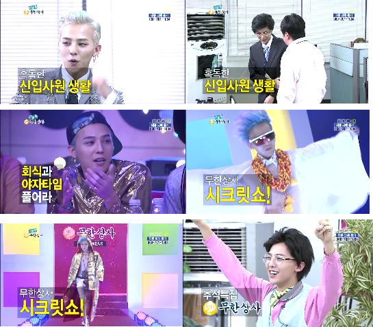 이날 방송에서는 꼰대 유부장을 웃기기 위한 무한상사 직원들의 고군분투와 함께 신입사원 모집 스토리가 진행될 예정. 특히 경쟁하는 사원들 모습 중 지드래곤이 있어 눈길을 끈다.