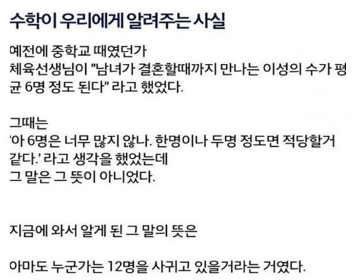 해당 게시물에는 "예전에 중학교 때였던가 체육 선생님이 '남녀가 결혼할 때까지 만나는 이성의 수가 평균 6명 정도 된다'고 했었다"고 밝혔다.