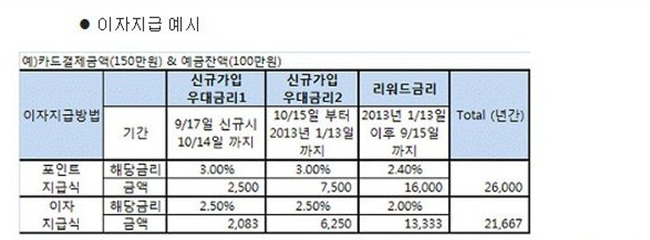 이자 구간은 '신규가입 우대금리1', '신규가입 우대금리2', '슈퍼리워드금리'로 나눠져 있다. 가입 후 익월 셋째주 첫 영업일 전날까지 금리인 '신규가입 우대금리1' 구간은 씨티카드 결제금액에 상관없이 최대 연 3.0%(세전)까지 이율을 받을 수 있다.