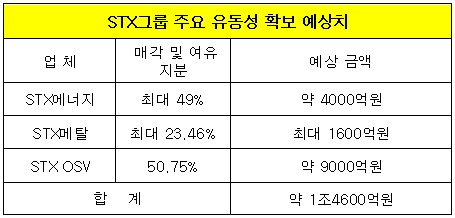 현재 STX그룹이 추진하고 지분 매각건은 STX에너지 대략 4천억원, STX OSV 9천억원 정도로 최대 1조3천억원 규모다. 또 STX메탈과 STX중공업을 합병시켜 최대 1천600여억원의 유동성까지 합치면 1조4천600여억원에 달한다.