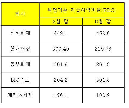동부화재는 RBC 비율이 261.8%에서 8월 말 281.1%로 20%포인트 가량 오를 것으로 보인다. 이는 지난 8월 국내 증시 기대감 등으로 자산운용 수익률이 높아진데 따른 것으로 풀이된다.