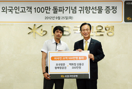 이번 이벤트의 행운의 주인공은 안산외국인력상담센터에 근무하는 외국인근로자 판데이 비벡(PANDEY VIVEK 29세,네팔)씨로 급여계좌를 개설하기 위해 KB국민은행을 방문했다가 100만번째 고객에 선정됐다.