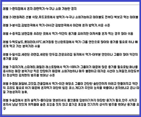 게시물에는 레벨 1 은 편의점에서 혼자 라면 먹기, 레벨2, 3천원짜리 선불 식당이나 푸드코트에서 밥먹기 등 차례대로 레벨을 분류하고 있다.