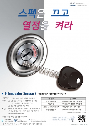 ‘H 이노베이터’ 2기는 현재 4년제 대학교에 재학 중이며 2013년 8월 졸업이 예정된 사람에 한해 지원할 수 있다. 접수는 다음달 4일까지 현대차 채용 홈페이지(http://recruit.hyundai.com)를 통해 가능하다.