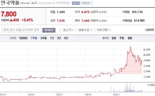 26일 한국거래소에 따르면 안국약품은 전날 장 중 8천470원까지 주가가 치솟았다가 장 후반 조정을 거쳐 전 거래일보다 5.41% 오른 7천800원에 장을 마쳤다. 지난 19일부터 상승세를 타기 시작해 5거래일 연속으로 주가가 오르면서 그 사이에만 주가가 7.9%나 상승했다.