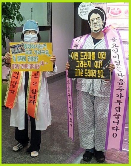 이 곳에 열혈 시청자를 자청하는 골든타임 인간 화환이 등장, 의사와 환자로 분해 '이런 드라마를 뭐라 그러는 지 아나? 고마운 드라마라 한다' '종방하시는 거 보고 가려구요. 골타랑 연애해?'라고 적힌 플래카드를 들고 서 있어 눈길을 끌었다.