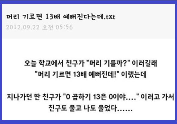 ‘머리 기르면 13배’ 게시물에는 “오늘 학교에서 친구가 ‘머리 기를까?’라고 질문해 ‘머리 기르면 13배 예뻐진데’라고 대답했다”고 했다.