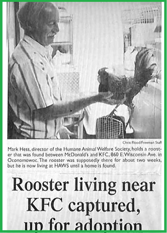 이 수탉은 해외 언론 보도에 따르면 ‘치킨집 미스터리 수탉’으로 불리며 미국 위스콘신주의 한 치킨 전문 패스트푸드 점에서 발견됐다.