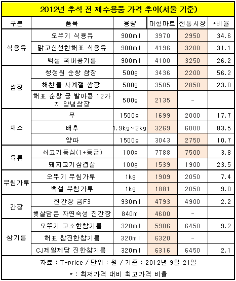 생필품가격정보싸이트 T-프라이스(T-price)가 제공하는 서울소재 유통업체들의 제수용품 평균 가격을 분석한 결과, 오뚜기 식용유와 맑고신선한해표식용유, 백설국내콩기름은 대형마트 보다 전통시장에서 최소 850원에서 최대 1천20원 저렴하게 판매되고 있었다.