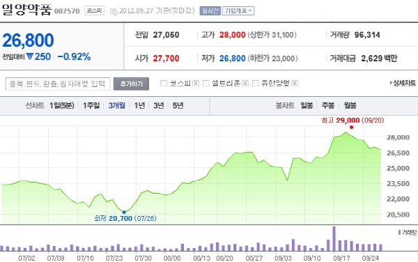 28일 한국거래소에 따르면 일양약품은 전일 2만6천800원으로 마감해 3개월 최고가를 기록했던 지난 20일 2만9천원에 비해 2천원 넘게 떨어졌다. 1주일만에 주가가 7% 가량 하락한 것이다.
