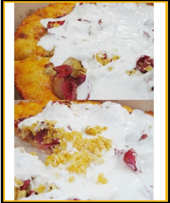 사진에는 피자 위에 크림이 엄청나게 뿌려진 모습이다.
