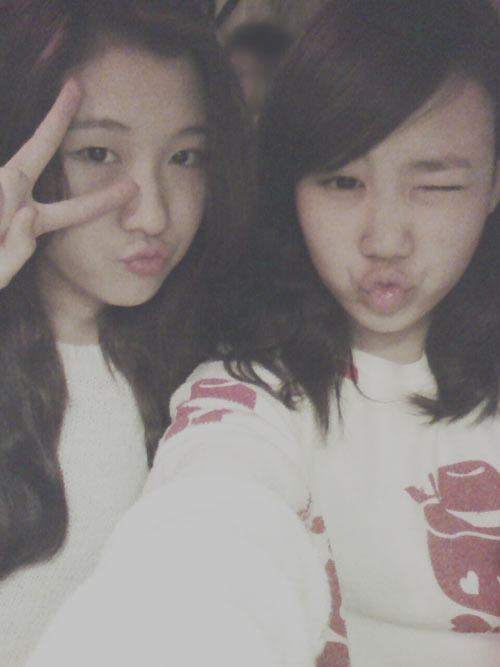 백예린 박지민 두 소녀는 입술을 쭉 내밀고 깜찍한 표정을 지어보이고 있다.