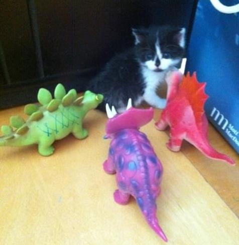 특히 공룡들이 자신을 둘러 싸자 새끼고양이는 무서워하는 듯한 표정을 짓고 있어 폭소를 자아낸다.