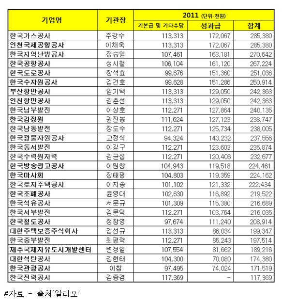 한편 성과급을 제외한 기본급과 기타수당만 놓고 보면 연봉 최하위를 기록한 한국전력공사 김중겸 사장이 1억1천700여만원으로 가장 높았다.