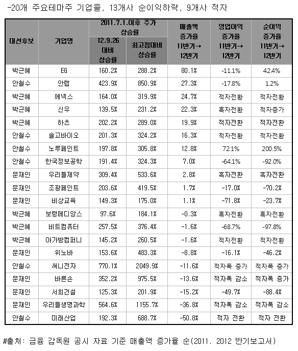 안철수 테마주인 노루표페인트와 박근혜테마주 보령메디앙스, 문재인 테마주 우리들제약 등 7개기업만 경영실적이 개선된 것으로 나타난 반면 나머지 13개종목은 매우 악화됐다.