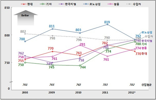 국산차 업체들의 경우 2008년만 해도 750~762점에 몰려 있던 기아차와 한국지엠, 쌍용자동차, 현대자동차가 최소 770점 이상으로 점수를 끌어올렸다.