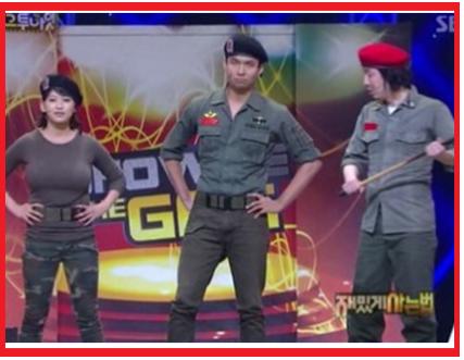 사진은 '개그투나잇'의 '쇼 미 더 개그'에서 한병준, 김건영, 장슬기가 개그를 보여주고 있는 장면으로 특히 장슬기의 군복입은 몸매가 눈길을 끈다.