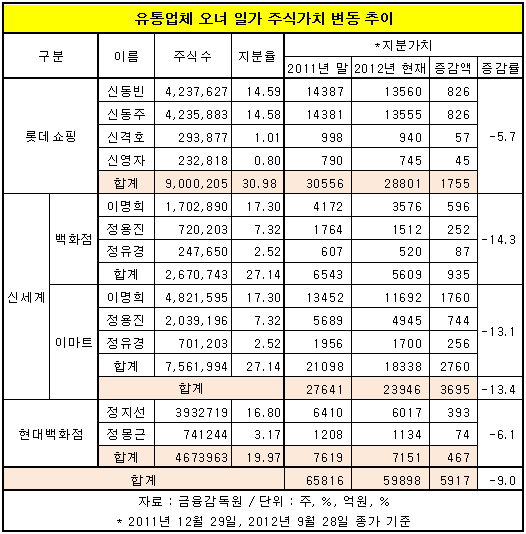 4일 금융감독원과 관련업계에 따르면 롯데쇼핑, 신세계, 현대백화점 등 유통 빅3 오너 일가의 지분가치는 2011년 12월 29일 종가기준 6조5천816억원에서 지난달 28일 종가기준 5조9천898억원으로 미끄러졌다. 이에 따라 오너일가의 주식 손실은 총 5천917억원에 달했다.