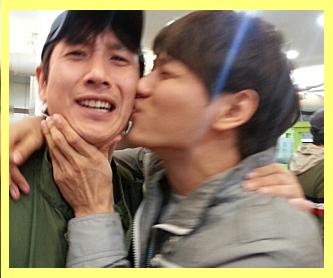 공개된 사진에는 지일주가 '골든타임' 종방연에서 이선균에게 볼 뽀뽀를 하는 모습이 담겨 있다.