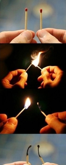 해당 사진은 연애를 시작할 때부터 마칠 때까지 서로의 감정을 성냥개비 불씨로 표현한 것. 먼저 남녀가 만나 어느 한쪽의 불씨가 타오르면 곧 다른 한쪽으로도 불씨가 옮아 붙는다.