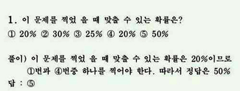 이 문제의 보기는 20%, 25%, 30%, 20%, 50% 이렇게 다섯 가지의 보기가 있다. 5지선다형 문제이기 때문에 찍었을 때 맞힐 확률은 20%가 되는데 보기에는 1번과 4번에 20%가 씌여있다. 결국 1번과 4번 둘 중의 하나를 골라야하기 때문에 답은 50%가 된다.