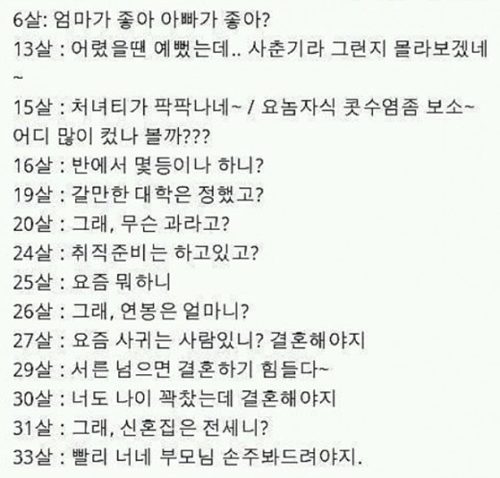 게시물에 따르면 6살에는 “엄마가 좋아 아빠가 좋아”라는 실없는 질문을 주로 받고, 15살 까지는 “어렸을땐 예뻤는데 몰라보겠네”, “처녀 티가 팍팍 나네”, “콧수염좀 보소” 등 사춘기로 인한 폭풍성장에 관련된 질문을 받게된다는 것.