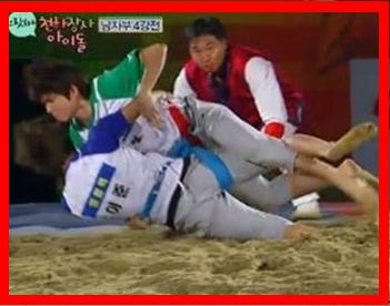 1일 오전 MBC 한가위특집 '으랏차차 천하장사 아이돌'에서는 100여명의 아이돌이 출연해 각 팀 대표 한명씩을 뽑아 씨름 한판 승부를 펼쳤다.