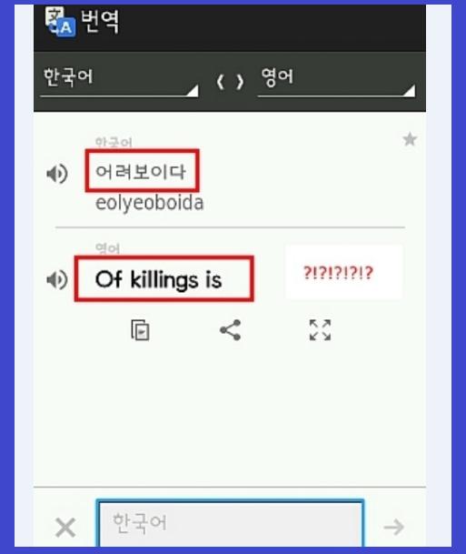 URL복사 기사공유하기 스크랩 프린트 메일보내기 글씨키우기 번역기의 배신 '번역기의 배신’이 화제다. 최근 한 온라인 커뮤니티 게시판에는 ‘번역기의 배신’이라는 게시물이 올라왔다. 게시물에는 ‘어려보이다’라는 단어를 번역기는‘Of killings is’라고 해석하고 있다. 번역기의 배신 게시물에 누리꾼들은 "죽이겠다고?", "무서운 번역기", "배신이네 무섭다"등의 반응을 보였다. 사진=온라인 커뮤니티 저작권자 © 소비자가 만드는 신문 무단전재 및 재배포 금지 온라인 뉴스팀 다른기사 보기 URL복사 기사공유하기 주요기사 함영주 회장 "지점 2곳에서 시작한 하나금융, 누구보다 건강하게 성장" 3년간 지구 5바퀴 거리 비행한 김동연 지사, 100조 투자유치 조기 달성 이유 있네 DL그룹, 2026년 사장단 인사…DL이앤씨 박상신 대표, 부회장 승진 대웅제약, ‘펙수클루 20mg’ 출시..."국내 최초 소염진통제 복용 환자, 궤양 예방 효능 확보" 젝시믹스, '온기 Dream 김장 나눔' 행사 전개...김치 4500kg 복지 사각지대 이웃에 전달 대상, 유럽 최대 식품 박람회 ‘FiE 2025’ 참가…글로벌 소재 사업 역량 확대