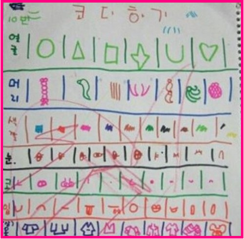 해당 사진은 스케치북에 다양한 얼굴, 머리, 눈과 코 , 입, 옷 등을 직접 손으로 그려넣어 선택할 수 있도록 만들어 놨다.