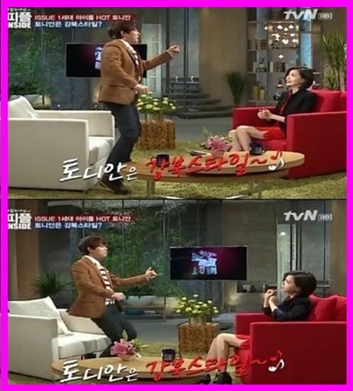 토니안은 2일 방송된 tvN ‘백지연의 피플인사이드’에 출연해 강남스타일 패러디인 강북스타일을 선보였다.